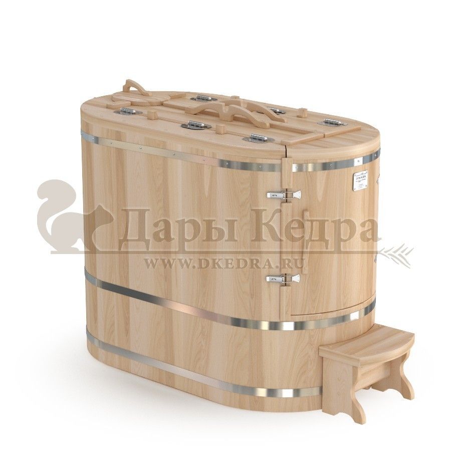 Кедровая бочка (фитобочка) овальная «Классическая» Овальная фитобочка из кедра - это мини парная, которую можно использовать не только в спа-салонах, но и дома. Овальная модель более просторна и удобна в использовании. Толщина стенок составляет 25 мм. Она оборудована откидными створками, дверцей и отверстием для головы. Во время парения человек сидит внутри кедровой бочки, а голова находится снаружи. Благодаря этому исключается возможность перегрева. Подлокотники из кедра, встроенные ручки на створках и двери делают эксплуатацию более удобной. Парение в фитобочке благотворно влияет на организм в целом: повышается иммунитет, выводятся шлаки и токсины, улучшается работа органов тела и состояние кожи.