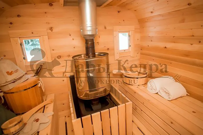 - Бочкообразные конструкции отличаются от своих соотечественников формой, поэтому пар равномерно распределяется внутри парной, а значит такая модель особенно быстро нагревается даже в мороз.