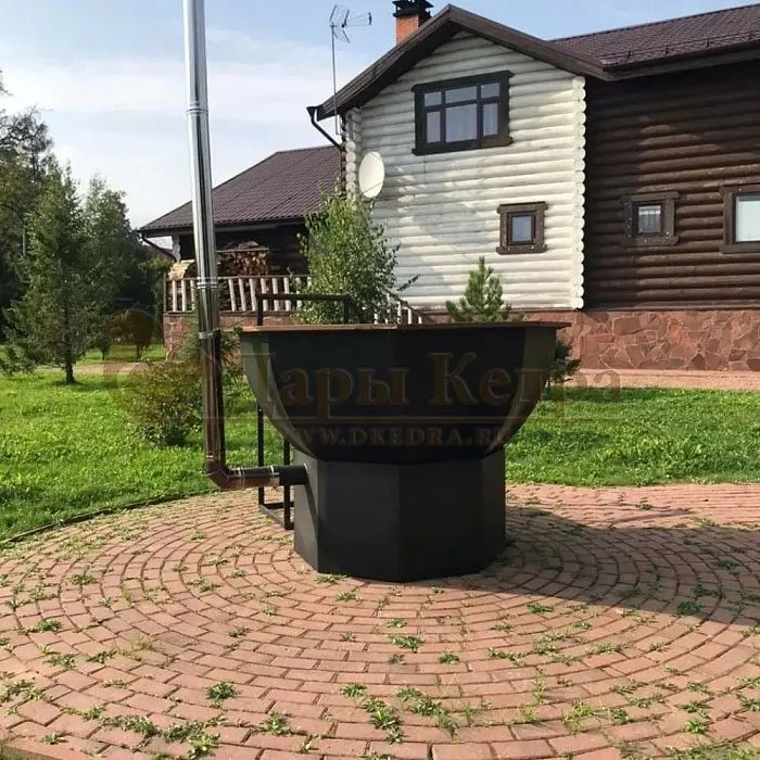 У стальной ёмкости расположение печи предполагается только под самой чашей, обеспечивая равномерный прогрев. Если нет возможности сразу купить конструкцию с печкой, то можно под чашей разводить костер, согревать воду таким, более дешевым путем. В уличной купели вариант размещения источника тепла может быть только снаружи или внутри. А значит, конструкция без печи работать полноценно не будет.